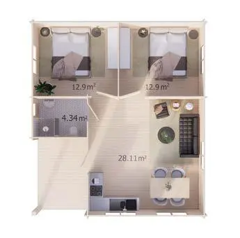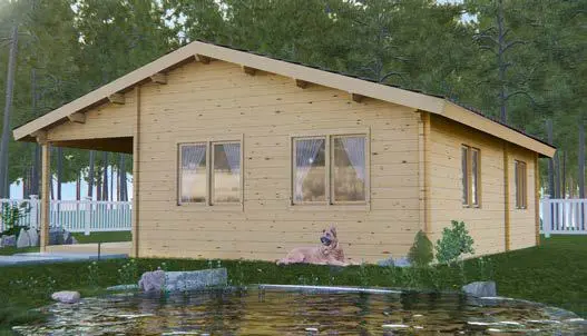 Casa de madera GENIL 59 m2 Ref. casas 81 GENIL 59 m2 (sin terraza) 6 ventanas, 4 puertas incluidas Espesor de pared mínimo recomendado: 68 mm Dimensiones: 7.7 x 8.7 m Altura total: 3679 mm Altura de la pared: 2430 mm Tamaño de la terraza: 8 m2