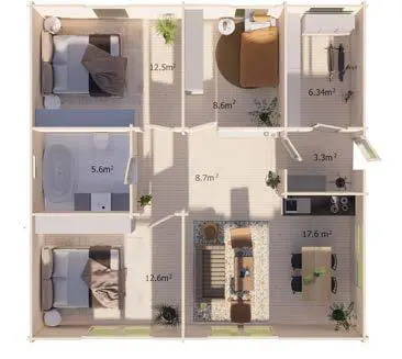 Caseta de jardín MILK 75.8 m2 Ref. casetas de jardín 76 MILK 75.8 m2 7 ventanas, 7 puertas incluidas Espesor de pared mínimo recomendado: 68 mm Dimensiones: 8.7 x 8.7 m Altura total: 3532 mm Altura de la pared: 2295 mm